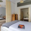 The apartment has a comfortable living area with sofas and TV. Tiled flooring adds some charm to the room. Next to the living space, you will find a working area with natural light coming from the big windows. Living room space includes a dining area, a table with comfy chairs that can accommodate all your group.